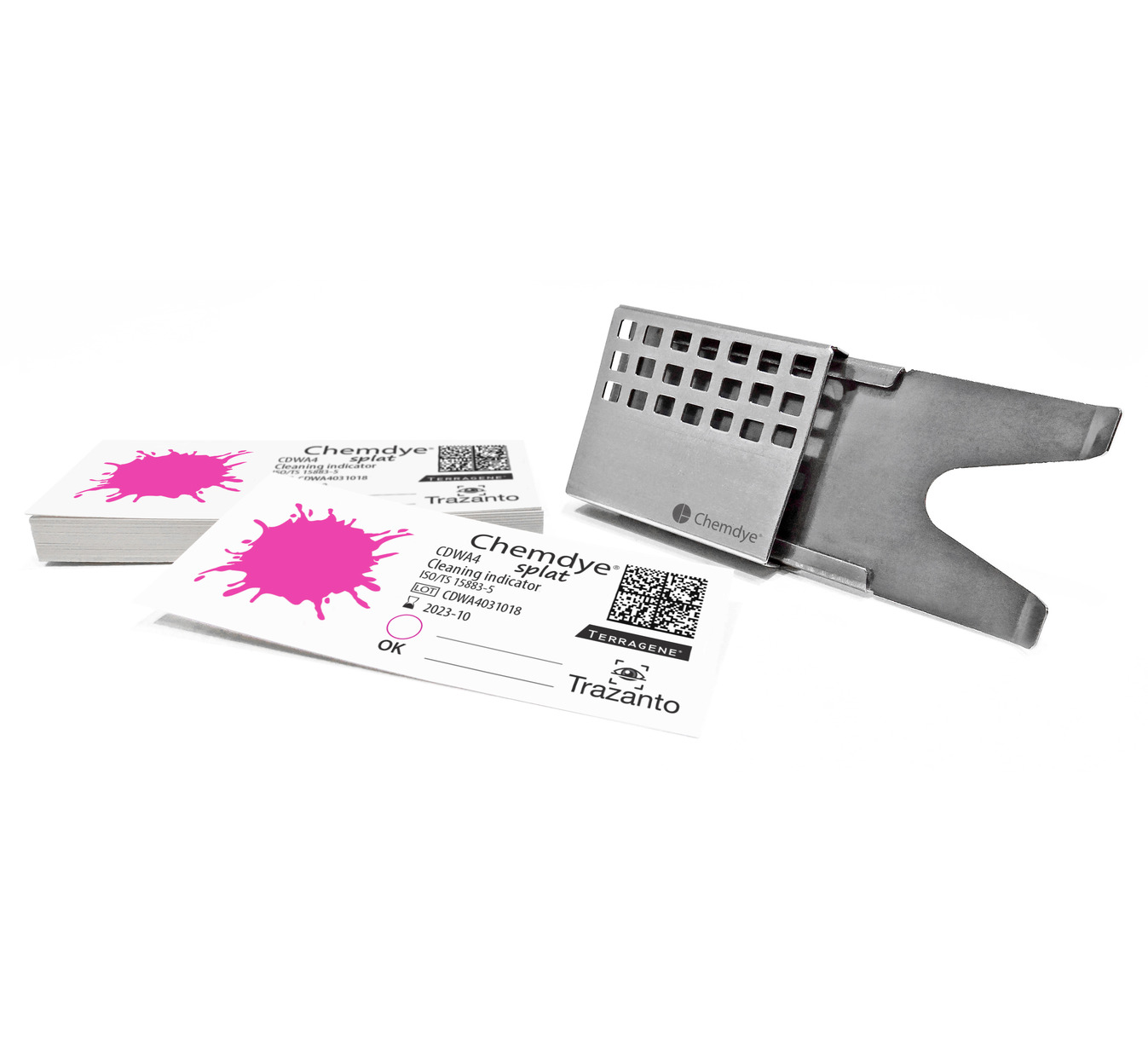 Gli indicatori Chemdye Splat CDWA3 e CDWA4 consistono in un supporto di 70 x 30 mm, con una miscela di componenti naturali colorati combinati (proteine, carboidrati, acidi grassi e coloranti) utilizzabili sia nei processi ad ultrasuoni che in termodisinfettore. L’efficienza degli indicatori é convalidata dal confronto con i campioni di terreno dettagliati negli annessi della norma ISO/TS 15883-5:2005.