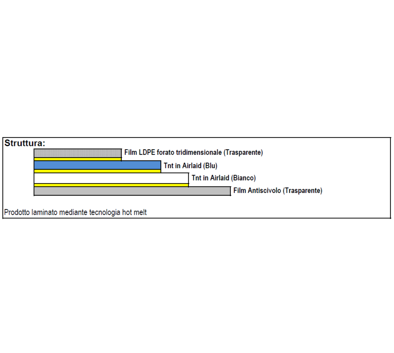Lo strato superiore, composto da un film forato tridimensionale trasparente, grazie ai coni ad imbuto consente un rapido e capillare assorbimento ed impedisce il reflusso dei liquidi.